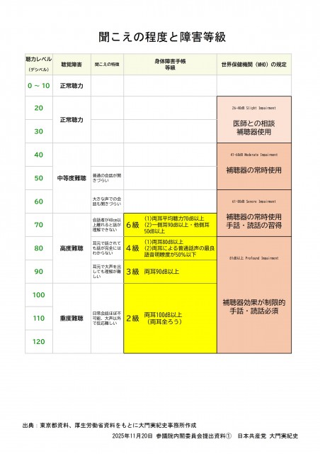 ◆大門議員/お手元に資料をお配り致しましたけれども、今、厚労省から説明あったのは、障害者認定ですね。で、70dBという、聞こえづらさが、左側に聴力のレベルありますが、高くなるほど重度なんですけれど、70dB以上になりますと障害者認定6級、手帳が交付されて6級になるわけですね。で、補聴器の補助も受けられると。ところがですね、ろう学校に通ってる子どもたちは、この70以上だけじゃないんですね。もう50から60ぐらいの子どもたちが実際には通っております。で、例えば60dBだと普通の会話は聞き取れません。補聴器をつけても、聴者の半分ぐらいも聞き取れるかどうかというんで、手話で補うしかないというようなのが実情でございまして、聞こえは重度とかこのレベルあるんですけど、補聴器だけはもう50以上は、ろう学校に通ってる子どもはもう必須になってるのに、こんなところで区別してるんで、補助受けられる子ども、受けられない子どもがいるということなんですね。