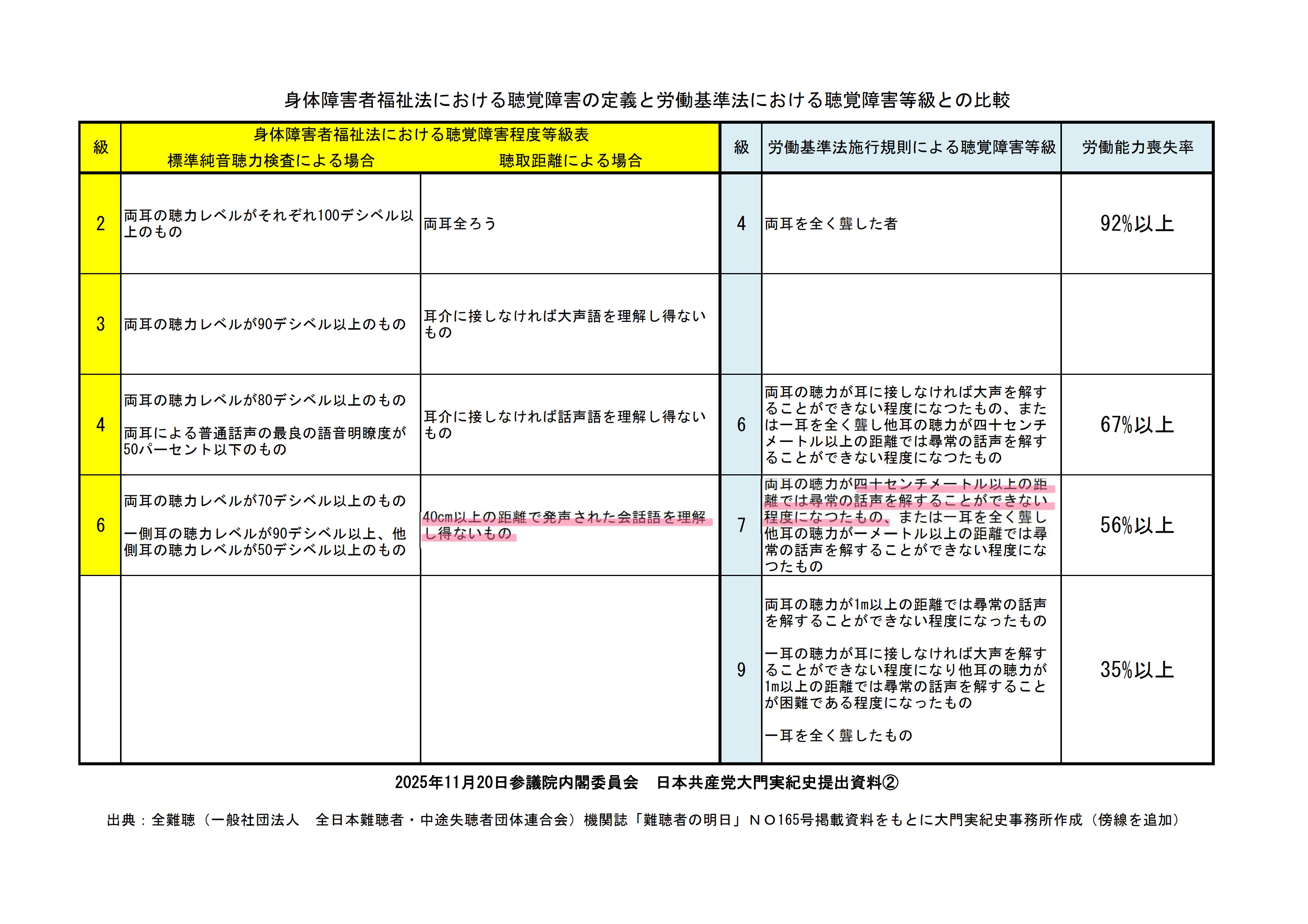 ◆大門議員/あの、よく調べてください。私調べました本当に。昭和24年の、身体障害者福祉法の定義から始まります。その時に、障害者、身体障害者の定義は「職業能力が損傷されている者」ということですね。で、聴覚障害者でいう、またこの表ですけどね、聴覚障害者でいう身体障害者等級6級というのは労働能力喪失率56%に該当すると、いう基準なんですね。で、元々もっともっと遡りますと、実は大正5年に施行された工場法というのがあります。そこからこの障害、労働基準法における障害等級というのが始まりまして、で、昭和2年の工場法施行令改正時に、労働能力喪失率による分類ということが行われて、昭和11年の改正が今の元になってます。今言われた昭和29年とか昭和59年はもっともっと後の話でございまして、始まりはそういうところにあって。