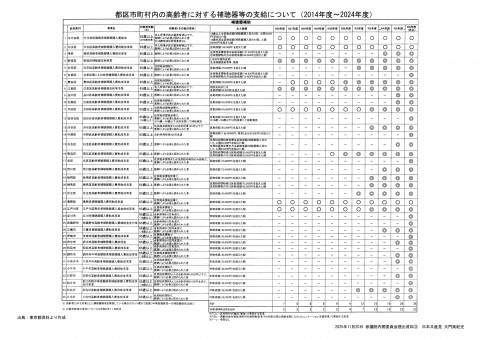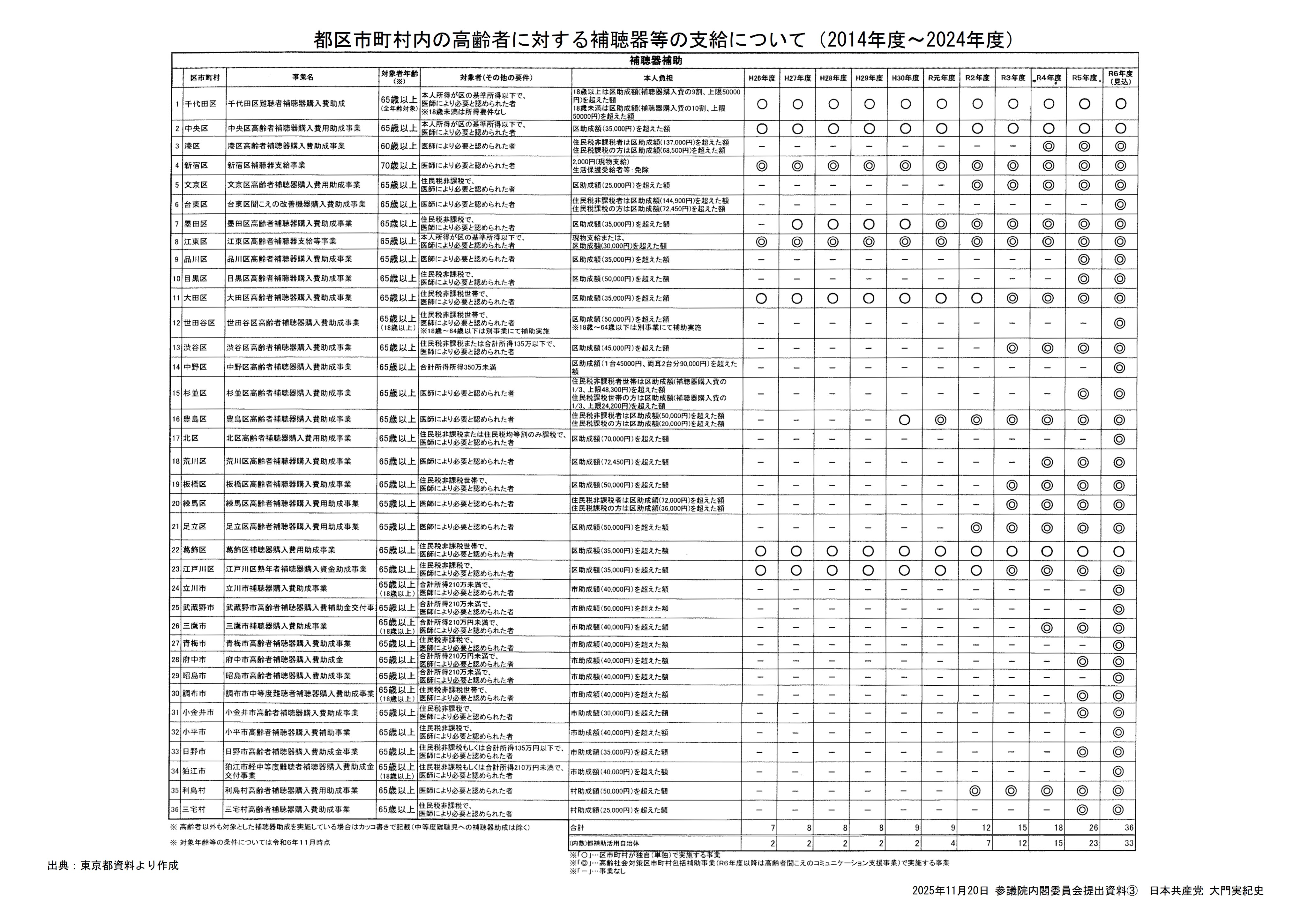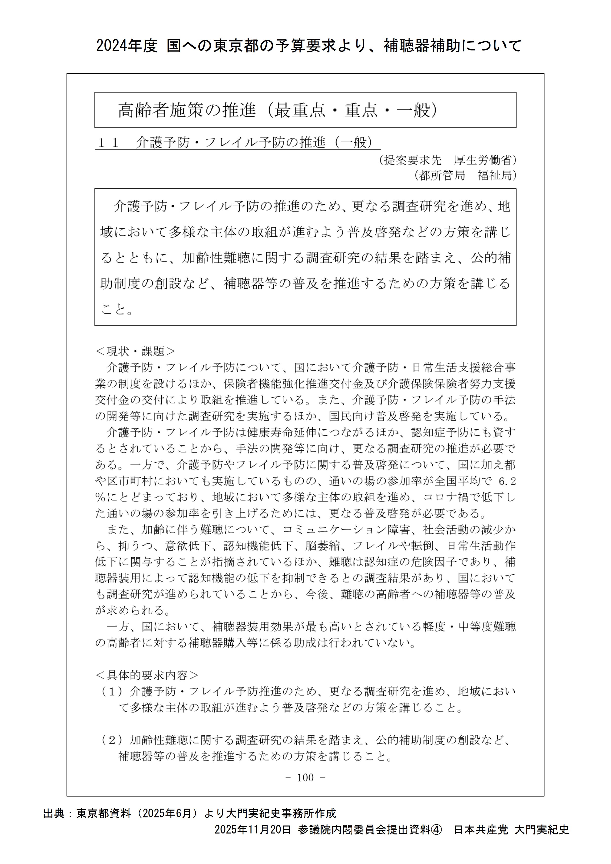 で、時間の関係でもう1つ、次の資料にございますが、この70dB問題というのは子どもたちだけじゃないんですよ。高齢者にも関わるんです。で、今、加齢性難聴と言ってですね、高齢者の方々の、耳が聞こえなくなって、それが認知症やいろんなことにつながるということで、これは厚労省としてもなんとかしなきゃということで対策を訴えておられますが、相変わらず、補聴器については障害認定70dB超えないから、国はお金出さないとなっております。で、お手元の資料は、東京都がもうこれだけの各自治体で、高齢者の補聴器購入について支援をしているという資料です。で、1番最後は東京都が国へその予算要望を要望しているという資料でございます。